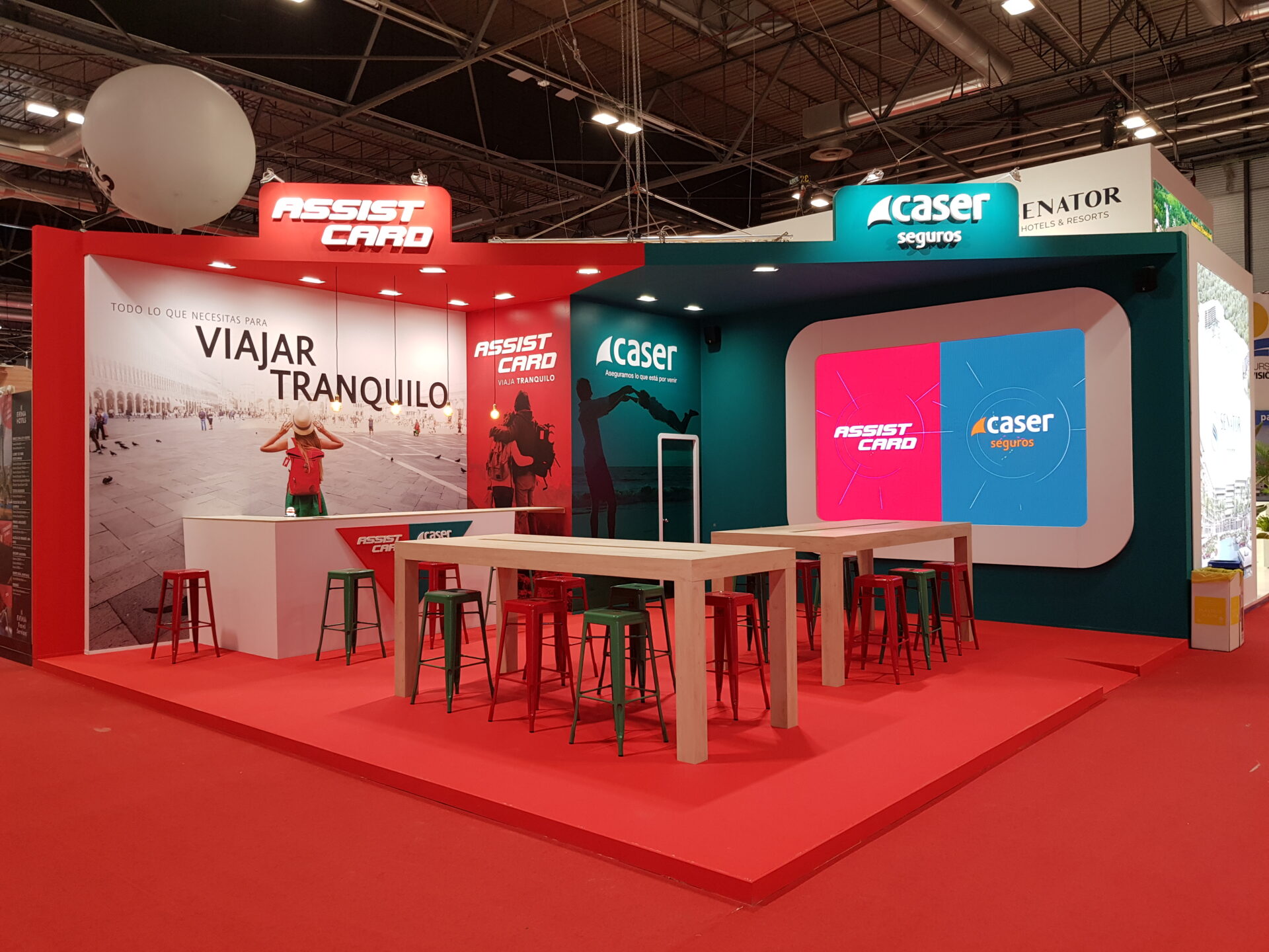 El principal reto de este proyecto fue diseñar un stand que respetara la identidad visual de dos marcas distintas —Assist Card y Caser Seguros— sin perder coherencia ni fuerza comunicativa. A través del uso del color, los volúmenes y la distribución, desarrollamos un espacio equilibrado que permite la convivencia de ambos universos bajo un mismo concepto expositivo.