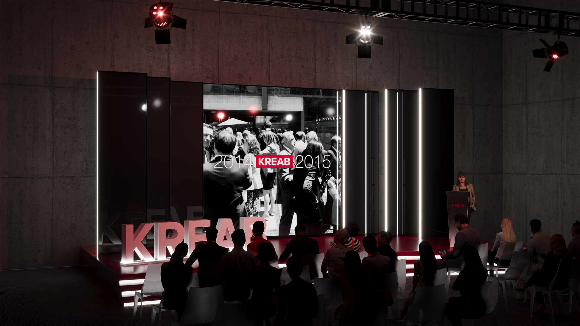 Diseño 3D que representa alternativas de diseño sobre eventos corporativos basados en la imagen de Kreab.